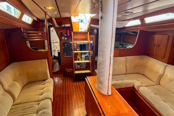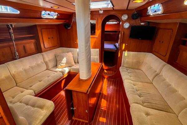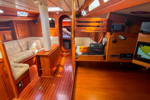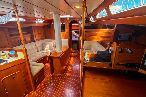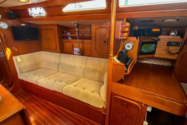 - Nav Station: Forward-facing chart table with custom teak fascia (2022), AC/DC panels, bookcase.