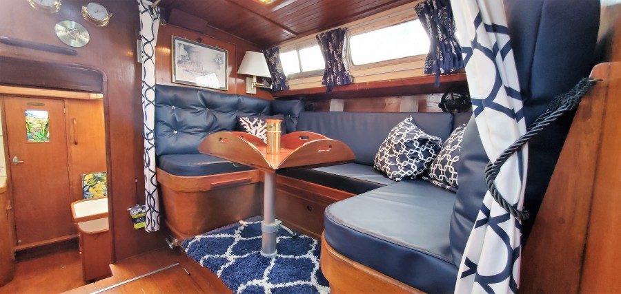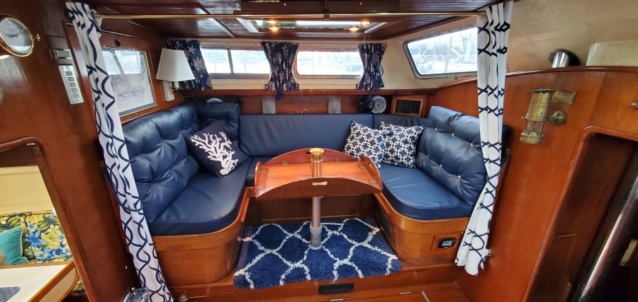 The companionway leads to the beautiful raised main salon. There are tempered glass windows forward and on the sides with a beautiful stained glass halogen backlit ceiling fixture. The port side settee has a hi/lo table that can be converted to a double berth. Curtains can provide additional privacy when used as a berth.