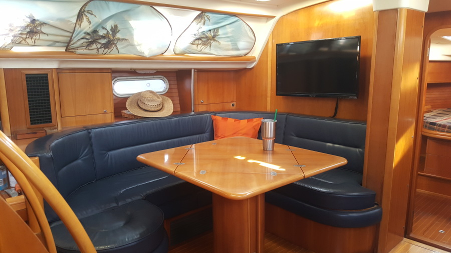 Continuing aft you are now in the main salon, on the starboard side are two built in chairs. Dividing these chairs is a cocktail table with storage below and behind. On the port side is u-shaped dinette with a custom table which fold inward to become a smaller coffee table rotating dining table, All seating in the saloon is finished in a rich Navy Leather. This area is extremely bright and airy due to the expanse of windows offered with a raised salon layout and large overhead hatches and a smoked Plexiglass companionway. There is plenty of storage in this area beneath and behind the furnishings.