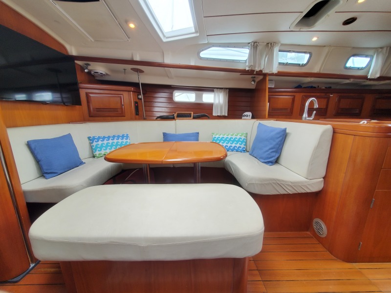 This sailing vessel is spacious and comfortable with many luxurious accommodations. The varnished cherry interior and abundance of natural light creates a pleasing ambiance.