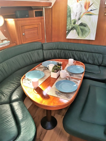 Three Cabin - Two Heads - Convertible Salon Table - Sleeps Eight. Ultraleather interior fabric, innerspring mattresses, air conditioning, separate shower compartment, varnished teak joinery, ash side paneling, excellent lighting and ventilation.