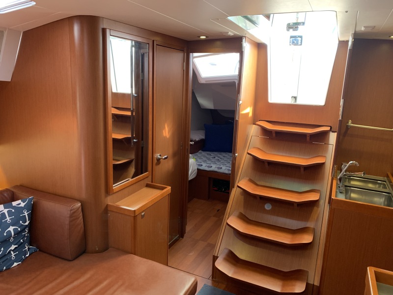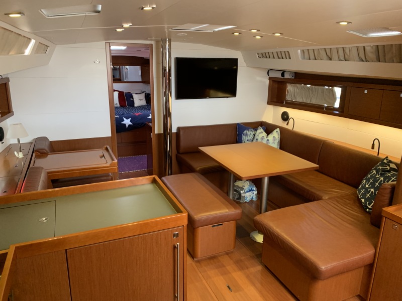 An adjustable Dining Table capable of seating 7 to 8 people is to starboard. To port is another great Beneteau design feature: Two plush seats that can be quickly moved to create a small Sofa. A sliding table can either separate the two seats or slide aft or forward to make the navigation desk.